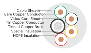 CCTV cables are designed to optimize the quality of video signals. The dense tin coated copper screen ensures complete elimination of EMI/RFI from video signals and also provides reduced DC resistance ground path. The multi stranded construction of video core offers better flexibility and reduced bending radius.